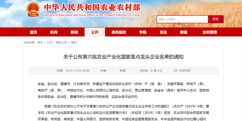 12月3日,农业农村部、国家发展改革委、财政部、商务部、中国人民银行、国家税务总局、中国证券监督管理委员会、中华全国供销合作总社联合印发通知,公布第六批 299 家农业产业化国家重点龙头企业名单,龙江熊猫体育网页版登录-熊猫(中国)公司榜上有名。